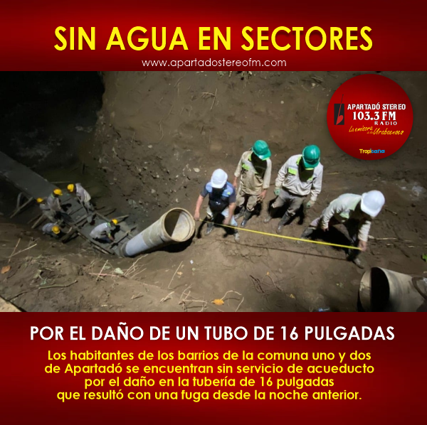 Los habitantes de los barrios de la comuna uno y dos de Apartadó se encuentran sin servicio de acueducto por el daño en la tubería de 16 pulgadas que resultó con una fuga desde la noche anterior.