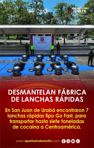 Tropas de la Décima Séptima Brigada, en coordinación con el Grupo de Investigaciones Interagenciales de la Policía Nacional, lograron desmantelar una fábrica de lanchas rápidas tipo Go Fast en la vereda Belén, municipio de San Juan de Urabá, Antioquia. En el lugar se encontraron siete embarcaciones diseñadas para transportar hasta siete toneladas de clorhidrato de cocaína, junto con 16 motores fuera de borda de 300 caballos de fuerza.