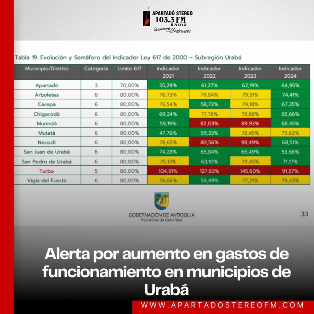 Un reciente informe reveló el comportamiento de los municipios de Urabá frente al cumplimiento de la Ley 617 de 2000, que busca controlar los gastos de funcionamiento de las administraciones locales, es decir, lo que se invierte en sueldos, funcionamiento interno y operación de los gobiernos municipales.