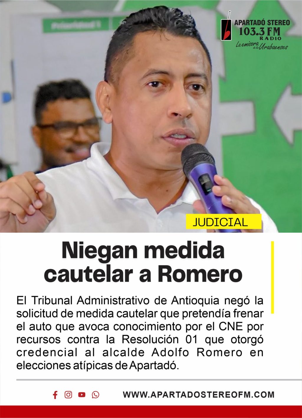 El Tribunal Administrativo de Antioquia negó la medida cautelar solicitada por Adolfo David Romero Benítez, alcalde del municipio de Apartadó, dentro de los procesos de nulidad electoral que buscan anular su elección.